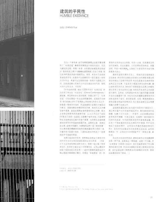 DV 作品的拍摄,缘起于2006年6月“标准营造”参加在荷兰举办的“中国当代”(China Contemporary)建筑展。两位青年学生前往阳朔,拍摄记录下了“标准营造”小街坊落成一年之后的影像资料。在短短3分钟里,他们的镜头穿行于阳朔的山水街巷与市井生活之中,就像是一幅城市风情画,而这座建筑只是偶尔才被经过与瞥见,酒旗商幌在骑楼坊柱间升悬,烛光灯火从木栅花窗中透漏,童叟妇孺围坐青砖漫地的街心闲聊,贩夫走卒穿过晴晴雨雨的曲巷忙碌,让人几乎忘记了这段DV是为了表现一座建筑、还是整个城市文化。只是那种种生活场景发生在城市的各个角落,也同样在这座新建建筑的里里外外迅速地弥漫开来。这样的立意,或者说是无意,是相当有趣的。当建筑的这样一段“周年影像”,与它那些强烈精确甚至有些冷酷的最初照片图纸一道,并置在荷兰的展厅里时,二者的反差共同构成了一座建筑的不可或缺的两面。