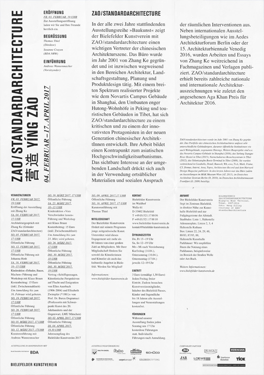 With ZAO/standardarchitecture, the Bielefelder Kunstverein is featuring an important representative of the Chinese architectural scene this year…By inviting ZAO/standardarchitecture under the title, 营造 YÍNG ZÀO (to build, to construct, to make), we would like to offer a deeper insight into the architectural development and approach of a Chinese architect. The selection of projects focuses on architecture’s socio-cultural responsibility and a practice particularly interested in micro houses.