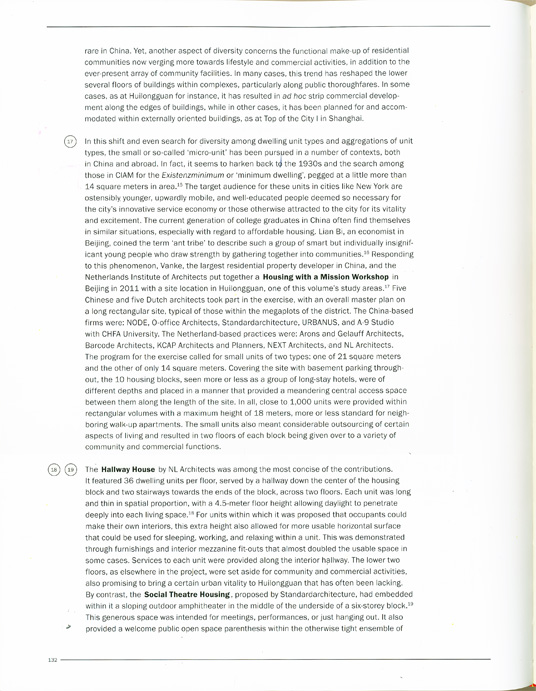 In this shift and even search for diversity among dwelling unit types and aggregations of unit types, the small or so-called ‘micro-unit’ has been pursued in a number of contexts, both in China and abroad. In fact, it seems to harken back to the 1930s and the search among those in CIAM for the Existenzminimum or ‘minimum dwelling’ , pegged at a little more than 14 square meters in area. The target audience for these units in cities like New York are ostensibly younger, upwardly mobile, and well-educated people deemed so necessary for the city's innovative service economy or those otherwise attracted to the city for its vitality and excitement. The current generation of college graduates in China often find themselves in similar situations, especially with regard to affordable housing. Lian Bi, an economist in Beijing, coined the term ‘ant tribe’ to describe such a group of smart but individually insignificant young people who draw strength by gathering together into communities.Responding to this phenomenon, Vanke, the largest residential property developer in China, and the Netherlands Institute of Architects put together a Housing with a Mission Workshop in Beijing in 2011 with a site location in Huilongguan, one of this volume's study areas. Five Chinese and five Dutch architects took part in the exercise, with an overall master plan on a long rectangular site, typical of those within the megaplots of the district. The China-based firms were: NODE, O-office Architects, Standardarchitecture, URBANUS, and A-9 Studio with CHFA University. The Netherland-based practices were: Arons and Gelauff Architects, Barcode Architects, KCAP Architects and Planners, NEXT Architects, and NL Architects. The program for the exercise called for small units of two types: one of 21 square meters and the other of only 14 square meters. Covering the site with basement parking through-out, the 10 housing blocks, seen more or less as a group of long-stay hotels, were of different depths and placed in a manner that provided a meandering central access space between them along the length of the site. In all, close to 1,000 units were provided within rectangular volumes with a maximum height of 18 meters, more or less standard for neigh-boring walk-up apartments. The small units also meant considerable outsourcing of certain aspects of living and resulted in two floors of each block being given over to a variety of community and commercial functions.