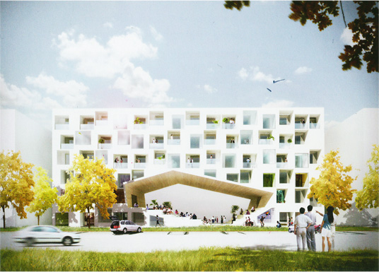 The Hallway House by NL Architects was among the most concise of the contributions. It featured 36 dwelling units per floor, served by a hallway down the center of the housing block and two stairways towards the ends of the block, across two floors. Each unit was long and thin in spatial proportion, with a 4.5-meter floor height allowing daylight to penetrate deeply into each living space. For units within which it was proposed that occupants could make their own interiors, this extra height also allowed for more usable horizontal surface that could be used for sleeping, working, and relaxing within a unit. This was demonstrated through furnishings and interior mezzanine fit-outs that almost doubled the usable space in some cases. Services to each unit were provided along the interior hallway. The lower two floors, as elsewhere in the project, were set aside for community and commercial activities, also promising to bring a certain urban vitality to Huilongguan that has often been lacking. By contrast, the Social Theatre Housing, proposed by Standardarchitecture, had embedded within it a sloping outdoor amphitheater in the middle of the underside of a six-storey block. This generous space was intended for meetings, performances, or just hanging out. It also provided a welcome public open space parenthesis within the otherwise tight ensemble of building blocks. Each unit also had a small exterior-facing balcony across its fac111ade. Among the schemes, four had very thin profiles in block width, whereas the other six were bulkier, aggregating more units together perpendicular to the outside faces of the building.