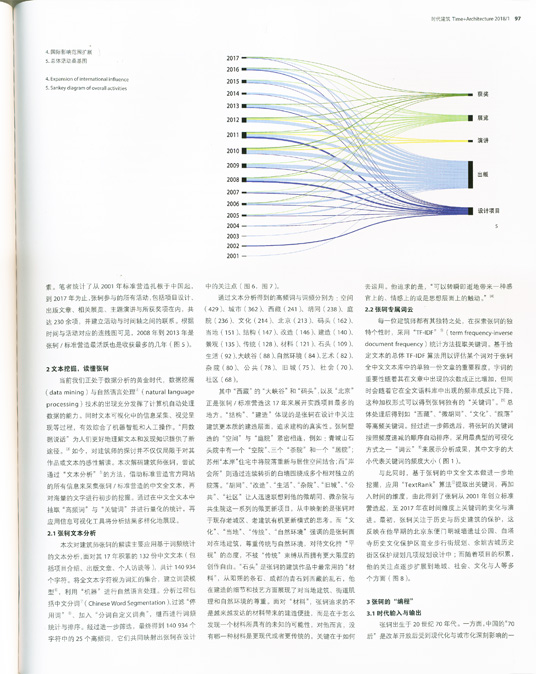 与此同时,基于张轲的中文全文本做进一步地挖掘,应用“TextRank”算法⑪提取出关键词,再加入时间的维度,由此得到了张轲从2001 年创立标准营造起,至2017 年在时间维度上关键词的变化与演进。最初,张轲关注于历史与历史建筑的保护,这反映在他早期的北京东便门明城墙遗址公园、白塔寺历史文化保护区商业步行街规划、余姚古城历史街区保护规划几项规划设计中;而随着项目的积累,他的关注点逐步扩展到地域、社会、文化与人等多个方面(图8)。