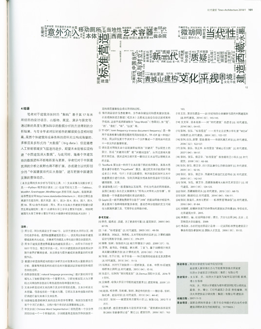 (本文应用的文本分析与可视化工具:1)文本采集与词频分析工具——Python 程序设计语言;2)信息可视化工具——Tableau,WordArt,Grasshopper,MindManager 思维导图,Gephi。数据来源:标准营造官网http://www.standardarchitecture.cn ;部分注释信息来源于百度百科。图片来源:图1、图2~ 图4、图6、图7、图9、图10、图12 由作者自绘;图5、图8 由东南大学建筑学院硕士研究生郑运潮绘制;图11 由清华大学工学学士曹东平绘制 。特别鸣谢清华大学工学学士曹东平对文中数据分析提供的技术支持!)