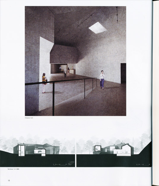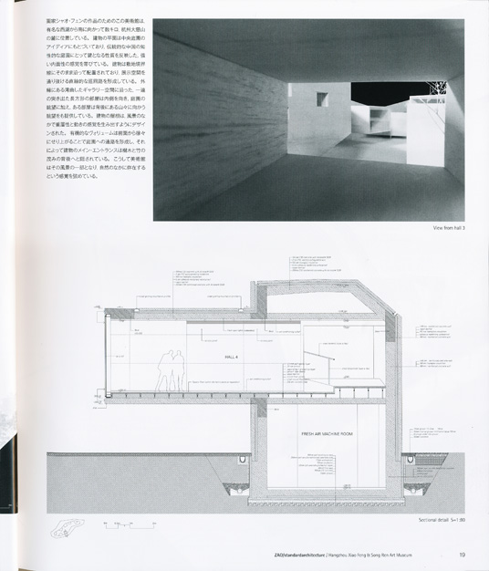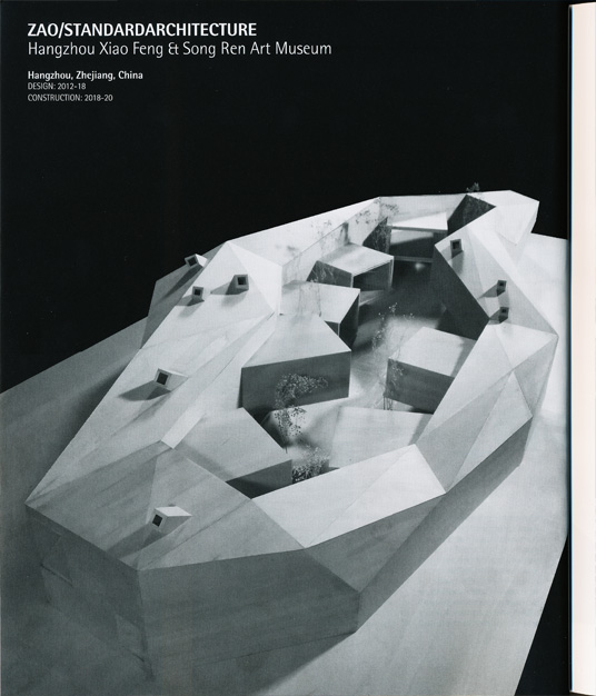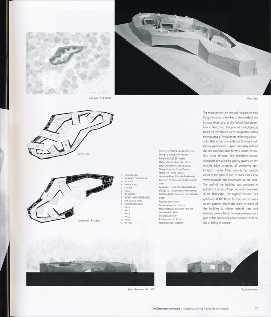 画家シャオ・フェソの作品のためのこの美術館は,有名な西湖から南に向かって数キロ,杭州大慈山の麓に位置している。建物の平面は中央庭園のアイディアにもとづいており,伝統的な中国の知性的な庭園にとって鍵となる性質を反映した,強い内面性の感覚を带びている。建物は敷地境界線にそのまま沿って配置されており,展示空間を通り抜ける直線的な巡回路を形成している。外縁にある湾曲したギャラリー空間に沿った,ー連の突き出た長方形の部屋は内側を向き,庭園の眺望加え,ある部屋は背後にある山々に向かう眺望をも提供している。建物の屋根は,風景のなかで重層性と動きの感覚を生み出すようにデザイソされた。有機的なヴォリュームは前面から徐々にせり上がることで庭園への通路を形成し,それによって建物のメイソ・エソトラソスは樹木と竹の茂みの背後へと隱されている。こうして美術館はその風景のー部となり,自然のなかに存在するという感覚を強めている。