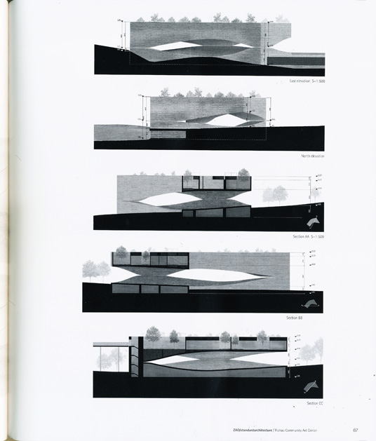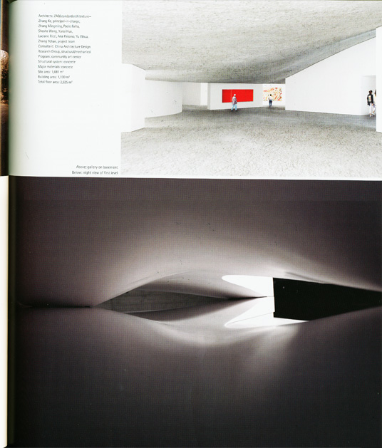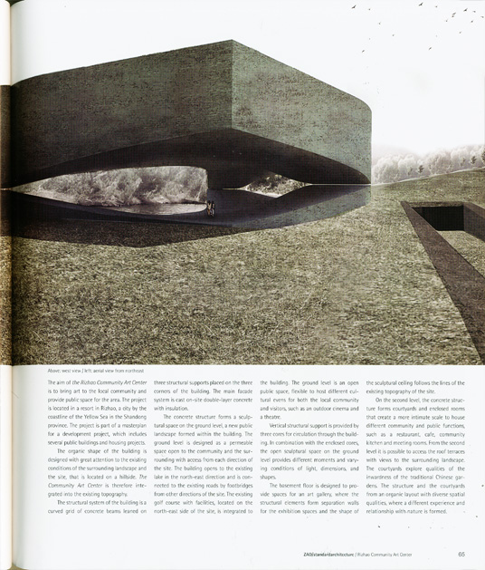 The aim of the Rizhao Community Art Center is to bring art to the local community and provide public space for the area. The project is located in a resort in Rizhao, a city by the coastline of the Yellow Sea in the Shandong province. The project is part of a masterplan for a development project, which includes several public buildings and housing projects.
