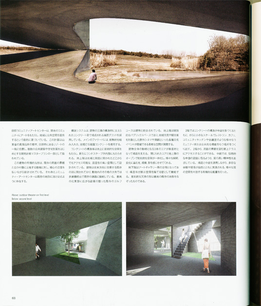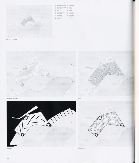 この建物の有機的な形は,既存の周囲の景観と丘の中腹に立地する敷地に対し、細心の注意を払いながら設計されている。それゆえコミュニティ一ア一トセンタ一は既存の地形に溶け込むように存在する。
