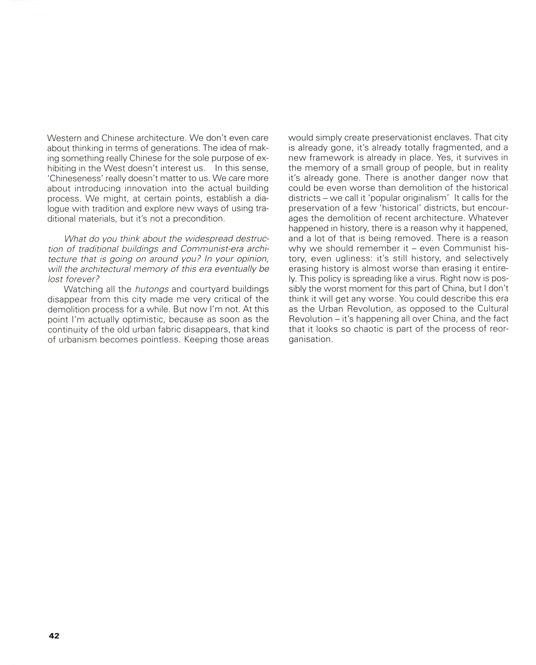 Watching all the hutongs and courtyard buildings disappear from this city made me very critical of the demolition process for a while. But now I'm not. At this point I'm actually optimistic, because as soon as the continuity of the old urban fabric disappears, that kind of urbanism becomes pointless. Keeping those areas would simply create preservationist enclaves. That city is already gone, it’s already totally fragmented, and a new framework is already in place. Yes, it survives in the memory of a small group of people, but in reality it's already gone. There is another danger now that could be even worse than demolition of the historical districts - we call it 'popular originalism' It calls for the preservation of a few 'historical' districts, but encourages the demolition of recent architecture. Whatever happened in history, there is a reason why it happened, and a lot of that is being removed. There is a reason why we should remember it - even Communist history, even ugliness: it's still history, and selectivelyerasing history is almost worse than erasing it entirely. This policy is spreading like a virus. Right now is possibly the worst moment for this part of China, but I don't think it will get any worse. You could describe this era as the Urban Revolution, as opposed to the Cultural Revolution - it's happening all over China, and the fact that it looks so chaotic is part of the process of reorganisation.