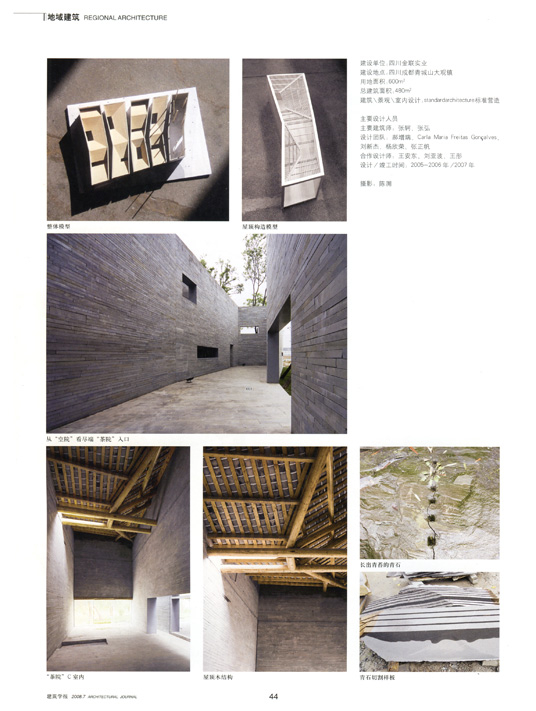 “石头院”位于青城山下的大观镇附近,建筑面积不到五百平米。“石头院”从外面看上去象一个较为完整的房子,事实上这是几个窄长院落很近地排在一起,分为一个“空院”、三个“茶院”、和一个“居院”。几个院的前面有一片小水面,远处朝向青城山,建筑的西面是一座石桥和一个石头牌坊,南面是一条小街和几座别墅。几条很窄的巷子从院子之间穿过,由于每个院落都略微转折了一下,小巷随之曲折。每个院子的转折角度不一样,石头墙夹缝形成的窄巷空间也就各不相同。这些巷子都把人们引向池塘边和山的方向,一天的不同时刻,每条窄巷里总会给人不同的光影感受。