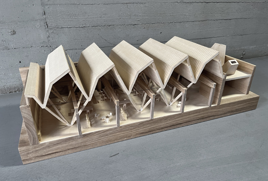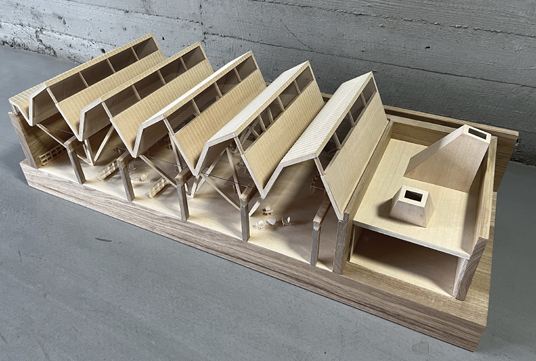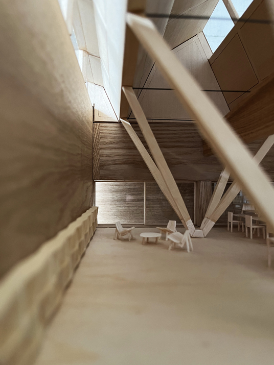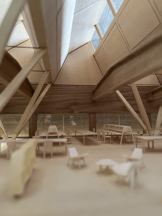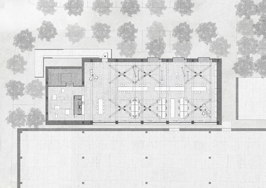 Among the concrete beams preserved, strategically clustered wooden columns grew, allowing for overhangs while maximizing a floor space that facilitates seamless zoning and functional flexibility. A new wooden roof adorned with northern skylights imbues the workshop area with heightened verticality and illumination. Each skylight is paired with an operable horizontal window to facilitate natural ventilation. Combined with the gentle diffusion of indirect sunlight and the existing solid walls, the design ensures a comfortable indoor climate year-round. The new wooden structure is tectonically independent but spatially symbiotic.