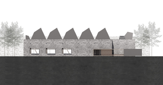 The west facade, separated from the neighboring building through a narrow gap, has new sliding doors to establish connectivity and usher in indirect light, and the gallery space roof features two new wooden cone skylights that offer centralized light sources to generate a more intimate setting. A functional island with a kitchen counter and a toilet module was added to transition between the gallery and the multifunctional workshop area that can be used as a lecture hall. A storage space and technical room complement the otherwise flexible space.
