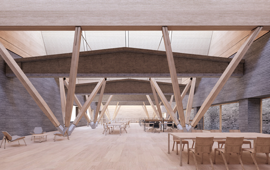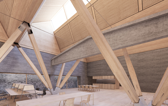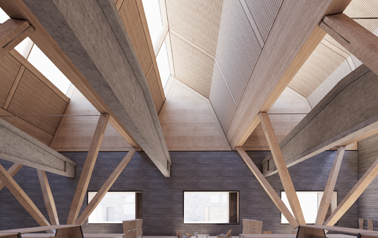 The new columns and beams are made of laminated timber, with acoustic wooden panels positioned between the beams. External walls are clad with recycled, grey bricks, echoing the visual language of adjacent buildings within the campus.