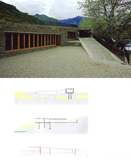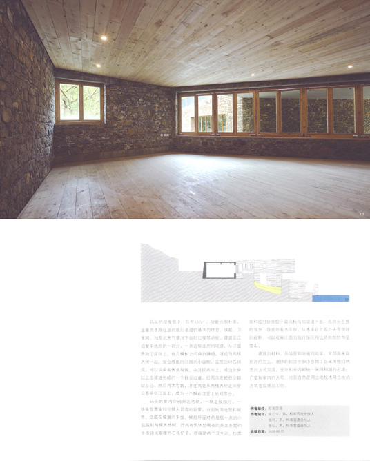 建筑的材料,从墙面到坡道的地面,全部是来自附近的石头,墙体的砌筑全部由当地工匠采用他们熟悉的方式完成,室外和室内都统一采用粗糙的石墙;门窗和室内的天花、地面自然是用当地松木用当地的方式在现场加工的。