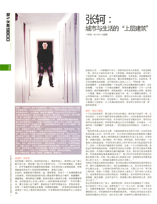 “我们属于新一代的建筑师。但是年轻的,并不见得都是新一代的。做出来的东西长得很时尚的,并不一定就是最时尚的。年轻的建筑师有这么几种——要么模仿西方,把西方的东西贩卖到中国来,这不是创新,这没什么新鲜的;要么把中国的东西挖出来,到西万去显摆显摆,也没什么新鲜的,还是水货,还是贩卖;还有一类就是死抱着中国的东西不放的,比如“我们一定要做中国的当代的建筑”。对我们来说,这些问题都不重要。中国的文化己经比较国际化了。我们的观念是,中国的新一代是没有国籍的边界的,当代的就是当代的,现代的就是现代的,没有所谓的中国建筑和西万建筑的差别,建筑就是建筑。老一代的名词,中国建筑,现代建筑,西方建筑,这些概念在我们这儿都不适用了,只有建筑这一件事情。我们已经不需要再去讨论什么是我们的,什么是他们的,全世界都是中国的,为什么不可以呢?说来说去,我们要以原创为最重要的立足点,而不是满足于学得像。我觉得原创没有那么难,就是一个很简单的事情,你别去抄就行了。为什么很多所谓的明星设计师,都一定要去抄呢?我觉得建筑作为文化中很重要的一个组成部分,建筑师们对自己的要求应该严一点,尤其是年轻的一代,不要今天蹦出个芙蓉弟弟,明天蹦出个芙蓉妹妹的。”