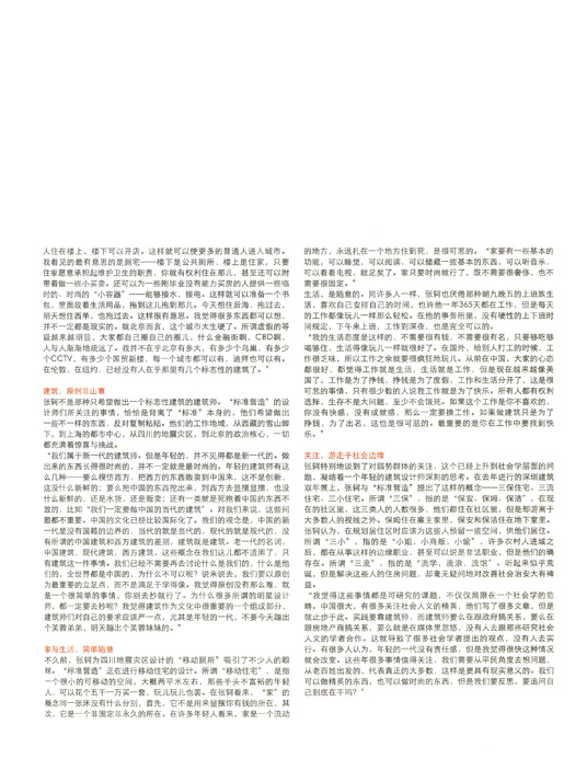 “我的生活态度是这样的,不需要很有钱,不需要很有名,只要够吃够喝够住,生活得像玩儿一样就很好了。在国外,给别人打工的时候,工作很乏味,所以工作之余就要很疯狂地玩儿。从前在中国,大家的心态都很好,都觉得工作就是生活,生活就是工作,但是现在越来越像美国了,工作是为了挣钱,挣钱是为了度假,工作和生活分开了,这是很可悲的事情,只有很少数的人说我工作就是为了快乐。所有人都有权利选择,生存不是大问题,至少不会饿死。如果这个工作是你不喜欢的,你没有快感,没有成就感,那么一定要换工作。如果做建筑只是为了挣钱,为了出名,这也是很可悲的。最重要的是你在工作中要找到快乐。”