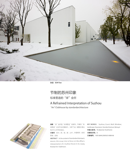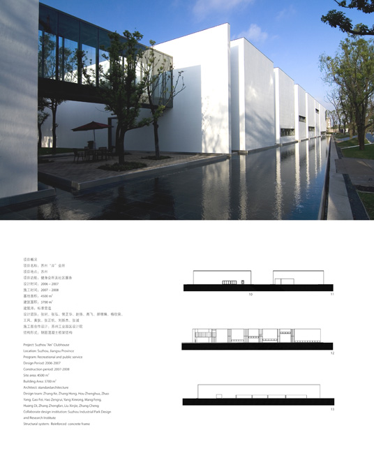标准营造倦于“仅仅按部就班地做一个满足功能的房子” ,提问、追问、争辩、盘问,往往是他们寻找不确定的设计动机的方式。以往,他们问:怎么做“一个既轻松又沉重的建筑”,怎么做“一个既玩笑又认真,既好奇又肯定的建筑”,怎么做“一个能够将‘什么都不是的地方’变成‘某个地方’的建筑”……他们用带着深深浅浅的矛盾修辞法的一组组问题追逐聚焦每一个项目兴趣的平衡点。事后观,我觉得特别属于“岸”会所的问题大概是 “怎么做一个既节制又抒情的建筑”,关于地方的问题,则会具体为:怎么做一个能将通属的“工业园区的一块地”变成古城“苏州的一块地”的建筑——毕竟,贝氏的苏州博物馆隔湖相望,不过10 km之遥。