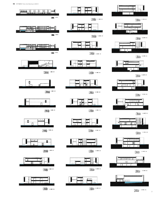 一排盒子,一排或有顶或没顶的盒子;一排院子,一排或有顶或没顶的院子。这是“标准营造”搭不厌的组合。2007年完工的青城山麓 “石头院”,并排5个彼此脱开的、都稍作转折的窄长院子,“空院”向天,连续折叠内向坡顶覆盖余下的4个院子,也留出8片天光,院间窄巷顿挫观山,院墙则由附近采石场出产的青灰色砂岩片材砌就。2008年完工的西藏林芝南迦巴瓦接待站,是沿土丘前后错落的3个有顶有天窗的盒子,石块大小杂陈的墙是日喀则师傅的手艺。这两座相继完工的建筑,都以地方色彩的砌筑墙体配合单纯又丰富的空间效果。“岸”会所的盒子进退、院落穿插显然远较前两例复杂,而墙面肌理却是最平整的白色粉刷。长条窗洞亦见于“石头院”和南迦巴瓦接待站,“岸”会所则区别处理了纵横墙面的开窗构造。东西向面街的墙体中,窗玻璃靠墙体内沿,以保证沿街立面的墙体厚度效果;南北向墙体中则设有多处600 mm高的“墙底窗”,玻璃居中,将波光水影带入室内,乃至起舞染上室内墙面。“岸”会所也灵活悠然地重演了“石头院”自“空院”开场的空间体验序列,从东界厚墙2.2 m高的门洞步入,面对的是香樟、榉树影婆娑的高墙,向右侧身,院子向水面开敞,天桥凌水而过。