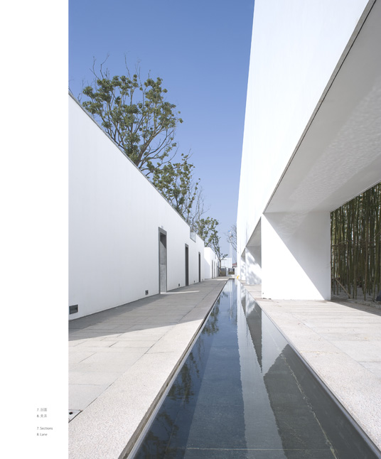 “岸”会所位于社区的北界,既为社区的门户所在,也充当社区私宅部分与城市道路间的屏障。会所自南施街沿琼姬路东向绵延五百余米。车行所见,是隔着一带渐宽水面的树影中时断时续的白墙,视线下沿是银光乍闪的三角锥草坡。白墙延续着“标准营造”对连续折叠 的兴趣,也延伸着他们对墙面虚实趣味的追求 。人行道上的两排31个三角锥草坡沿中线错落,间或以镜面不锈钢板覆面,映照着沿街的城市速度,别出新意 ;放低视点,“片山多致,寸石生情” ,水面及植树白砂草坡带则恍惚成了带硬边的米家云山。