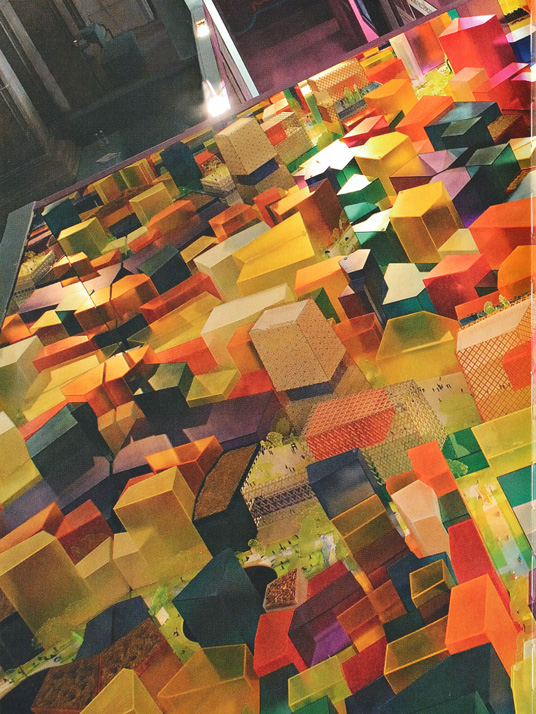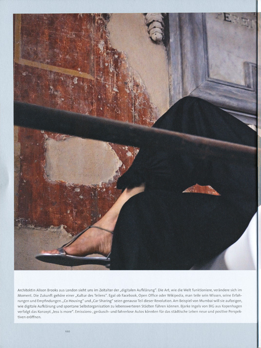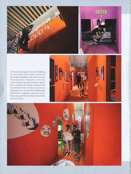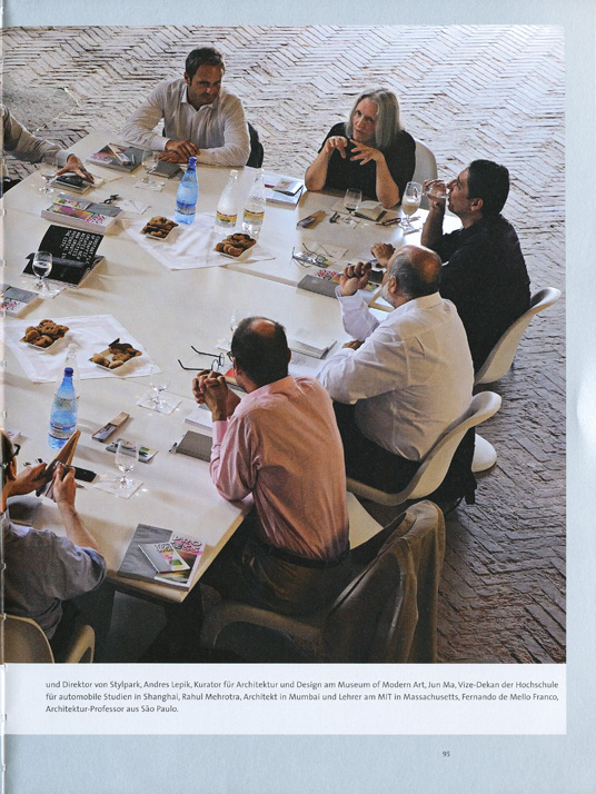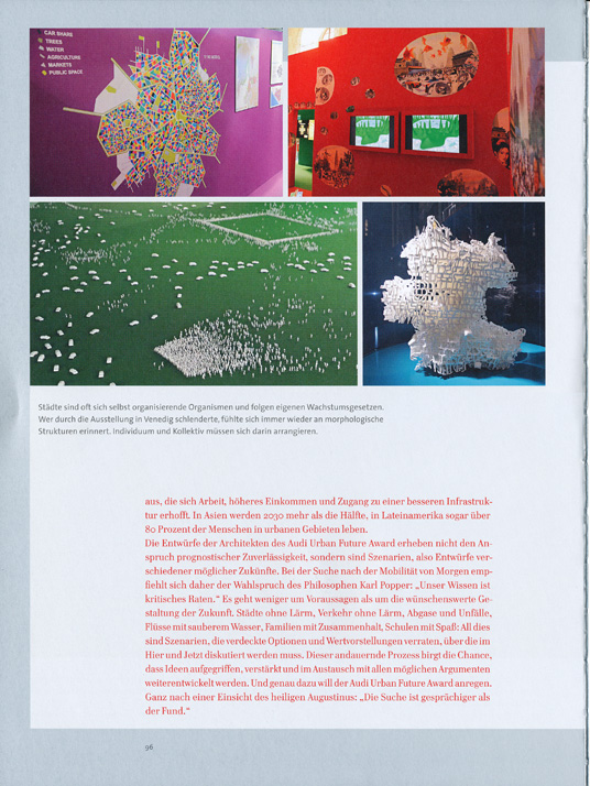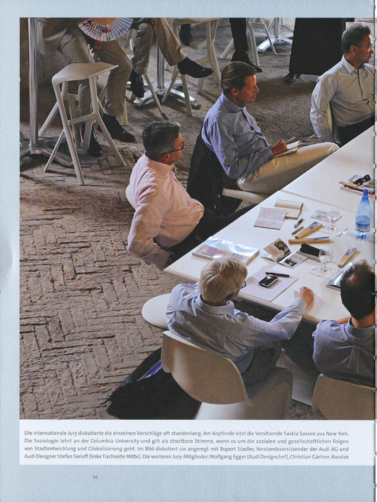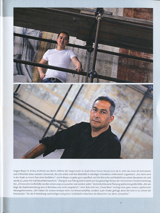 Fünfinternational führende Architekten beteiligten sich mit ihren Zukunfts-Entwür-fen an diesem höchstdotierten deutschen Architekturpreis: Alison Brooks aus London, die sich vom selbstorganisierenden Chaos Mumbais inspiriert und herausgefordert sah. Zhang Ke aus Peking, bei dem sich statt der Autos die Straßen fortbewegen. Enric Ruiz-Geli von „Cloud Nine! “ aus Barcelona, der die naturverbundene Parole ausgab: „The trees will be the boss“ (Die Bäume werden bestimmen). Bjarke Ingels von „BlG“ aus Kopenhagen, der sehr viel mehr an die Selbsterneuerungskräfte der Städte glaubt als an zentrale Planung. Schließich der Sieger, Jürgen Mayer H. aus Berlin, der die digitale und elektrische Revolution des Autos zu Ende denkt und beschreibt, wie ein digital organisierter Straßenverkehr in Städten ohne Lärm, Schilderverhaue und Parkplatzhalden münden könnte. Auto und Stadt werden von Mayer gemeinsam zivilisiert.