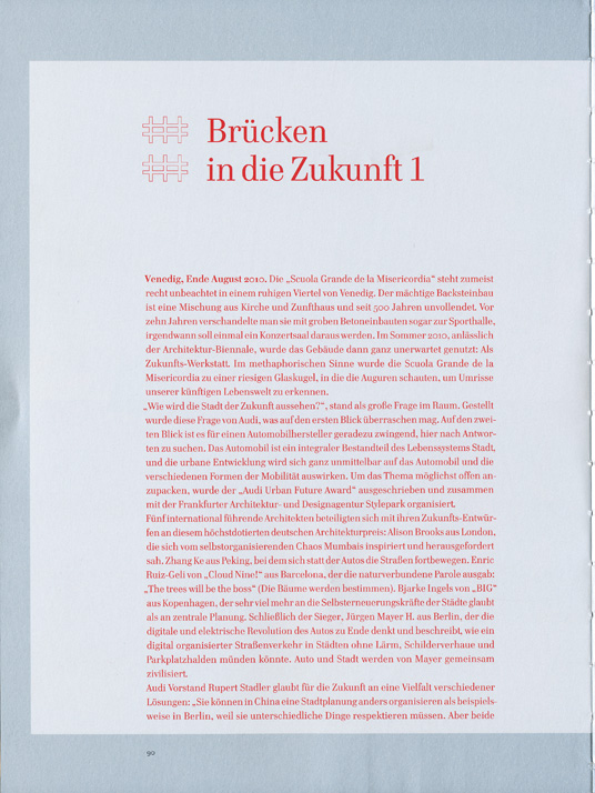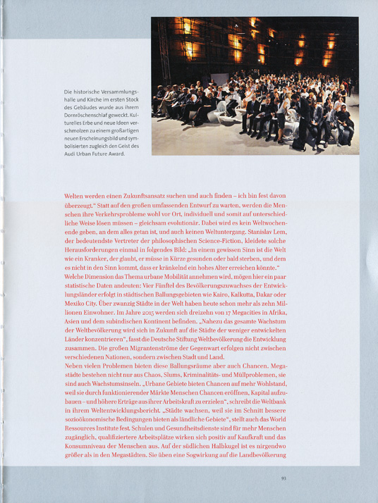 „Wie wird die Stadt der Zukunft aussehen? “, stand als große Frage im Raum. Gestellt wurde diese Frage von Audi, was auf den ersten Blick überraschen mag. Auf den zwei-ten Blick ist es für einen Automobilhersteller geradezu zwingend, hier nach Antwor-ten zu suchen. Das Automobil ist ein integraler Bestandteil des Lebenssystems Stadt, und die urbane Entwicklung wird sich ganz unmittelbar auf das Automobil und die verschiedenen Formen der Mobilität auswirken. Um das Thema möglichst offen an-zupacken, wurde der „Audi Urban Future Award “ ausgeschrieben und zusammen mit der Frankfurter Architektur-und Designagentur Stylepark organisiert.