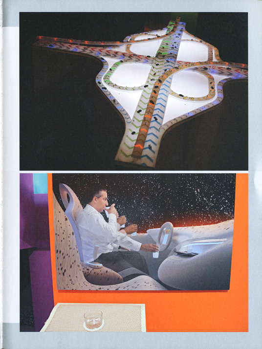 CHRISTIAN GÄRTNER:Wenn ich dazu einwerfen darf: Das Auto ist ein kulturell gepriätes Gut. Das Auto ist für die Menschen nicht mehr neu, sondern man ist es ge-wohnt. Odor anders gesagt: Das Auto ist gelernt. Gleich-zeitig hat es jenseits der Mobilität aber immer andere Funktionen mitgetragen -vielleicht subkutan und nicht immer ganz bewusst. Es ist einfach so, dass man sich im Auto beispielsweise privat fühlt. Das Auto ist ein Kokon und schafft eine Privatsphäre. Sie wird jetzt mit neuen Funktionalitäten aufgeladen. Es handelt sich um mobile Bewegung im privaten Raum und deshalb kontmt auch die Frage auf: Was möchte ich denn da alles dabei ha-ben? Bei unserer Zwischenpräsentation in London wurde gerade das neue iPad vorgestellt und die Leute standen vor den Geschäften Schlange. Ich glaube aber, dass solche einzelnen Gerätschaften nicht die Zukunft sind, sondern dass wir größere Zusammenhänge be-kommen werden, in denen Systeme funktionieren. Und da ist das Auto ein hervorragend bewährter Gegen-stand...