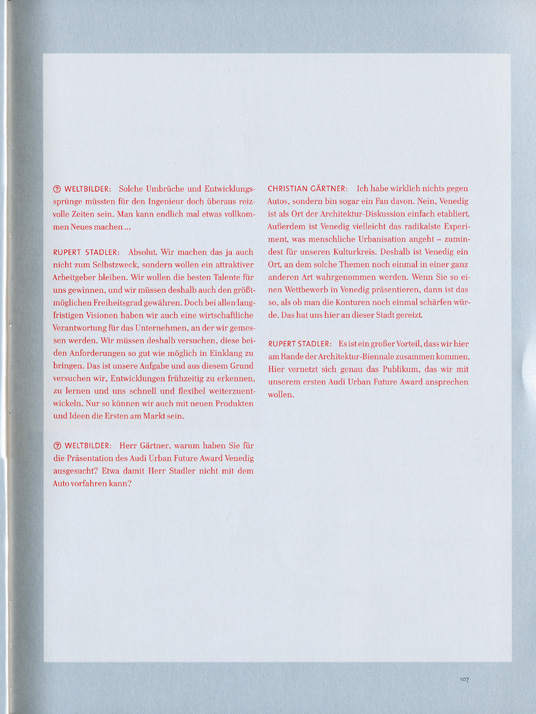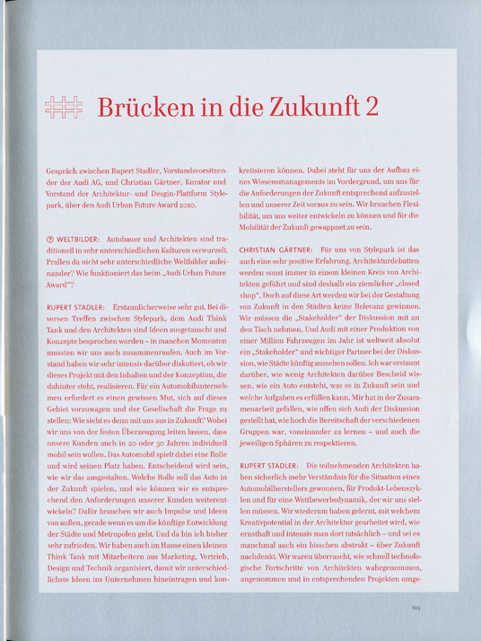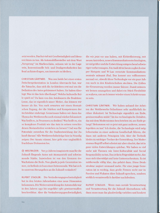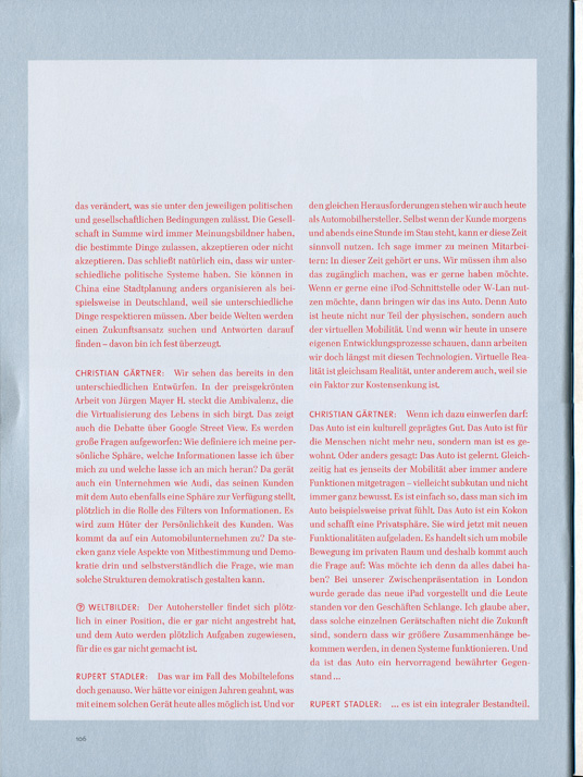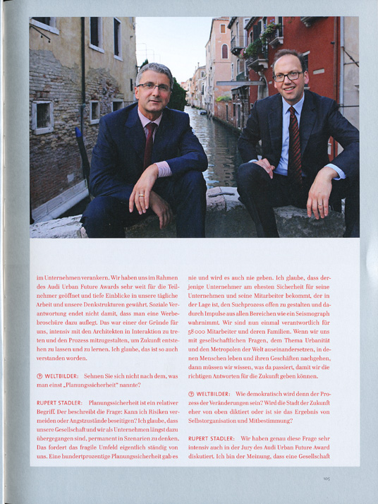 Gespräch zwischen Rupert Stadler, Vorstandsvorsitzen-der der Audi AG, und Christian Gärtner, Kurator und Vorstand der Architektur-und Desgin-Plattform Style-park, über den Audi Urban Future Award 2010.