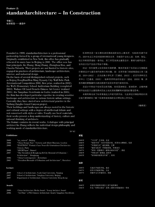 Tlie feature contains its recent works. A dialogue with principal architect Ke Zhang reflects the individual design philosophy and working mode of standardarchitecture.