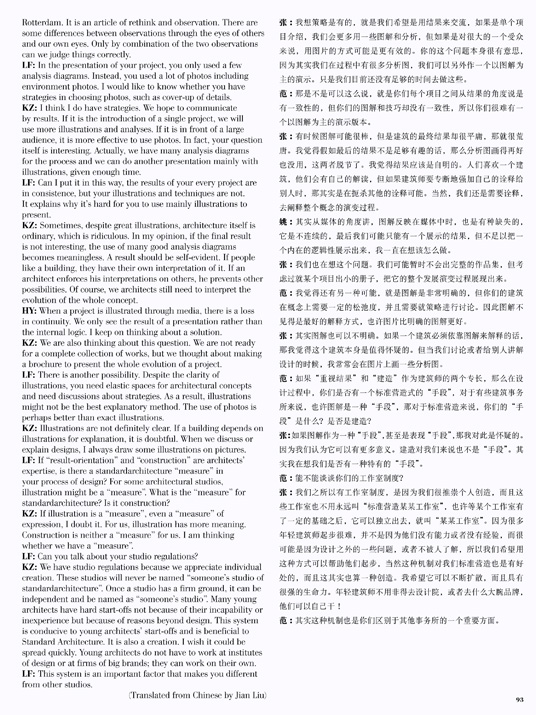 China rather than being interested in architects themselves. One architect is only taken as an example to support opinions of the media. We start to think about things during continuous interviews and questions. We pay much attention to international topics, such as "uncertainty" at the moment. Nobody knows the direction. I wrote an article named "outside in" after my participation in the "China Contemporary" exhabition in Rotterdam. It is an article of rethink and observation. There are some differences between observations through the eyes of others and our own eyes. Only by combination of the two observations can we judge things correctly.