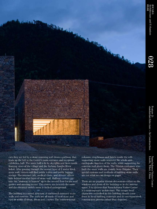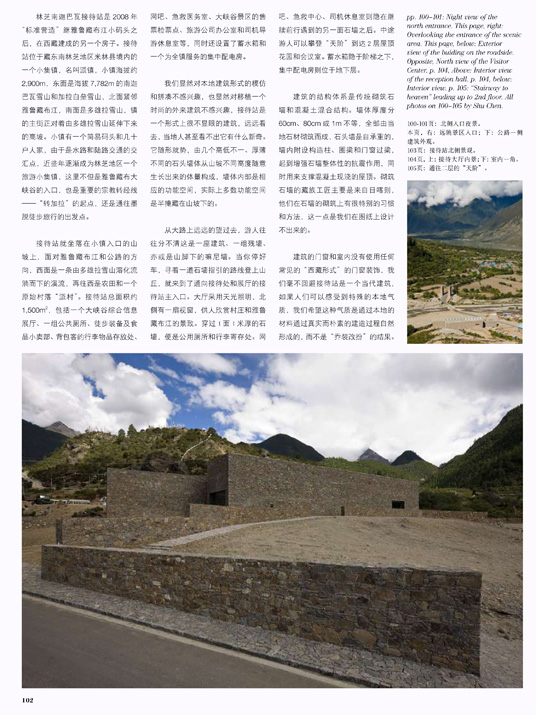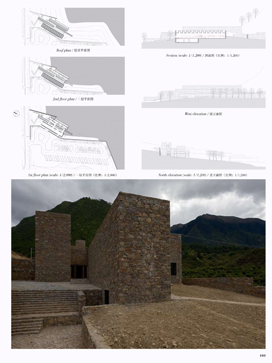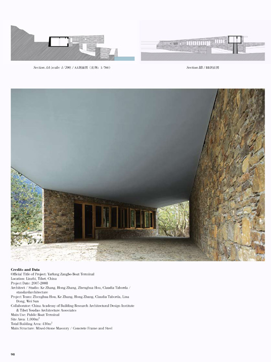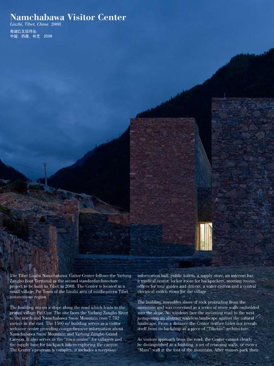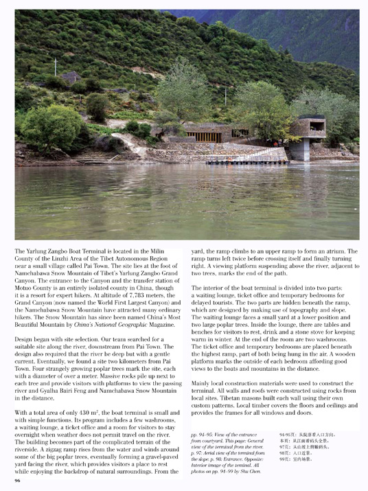 On the basis of several distinguished cultural projects, such as Beijing DongBianMen Ming Dynasty City Wall Relic Park (International Competition 2001, first prize, realized in 2002); tlie WuYi Elementary School Auditorium Building (completed 2003); Wuhan CR Land French-Chinese Art Center (realized 2005); the Yangshuo Storefronts in Guilin (realized in 2005), the firm has developed particular expertise in creating sensitive landscape and architecture in various historic urban settings. Currently they have started new architectural practice in the Yarlung Zangbo Grand Canyon project.