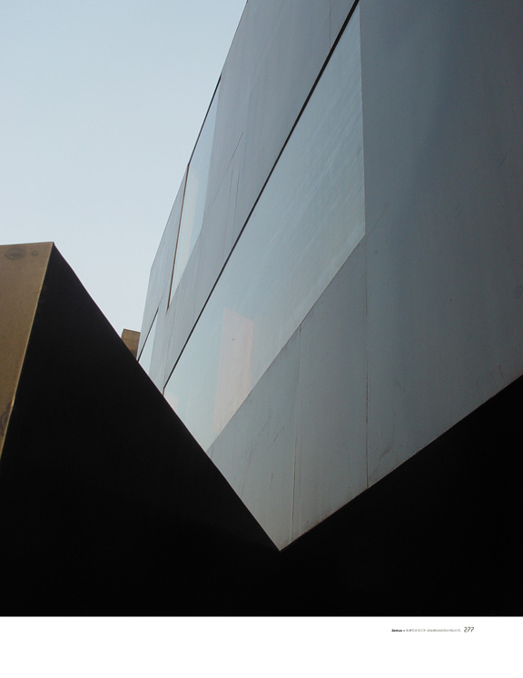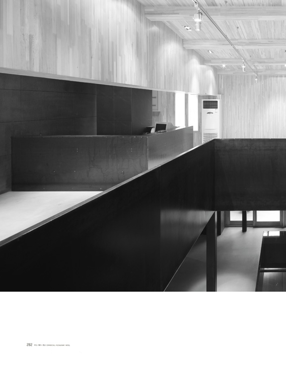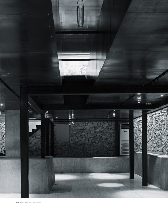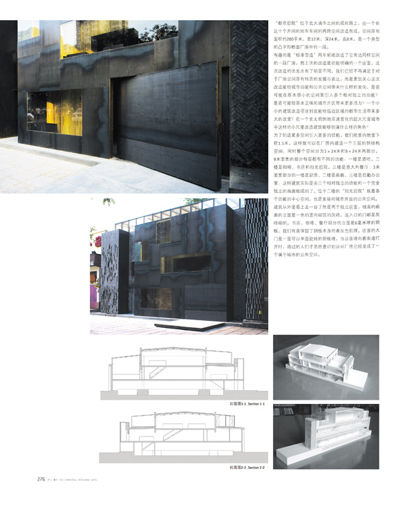 建筑从外面看上去一目了然是两个独立店面,细高的画廊的立面是一色的竖向砌筑的灰砖,连入口的门都是灰砖砌的。书店、咖啡、餐厅部分的立面是6毫米厚的钢板,我们有意保留了钢板本身的青灰色肌理。店面的大门是一面可以单面旋转的钢板墙,当这面墙向着街道打开时路过的人门才忽然意识到这间厂房已经变成了一个属于城市的公共空间。