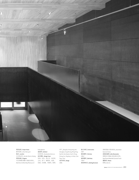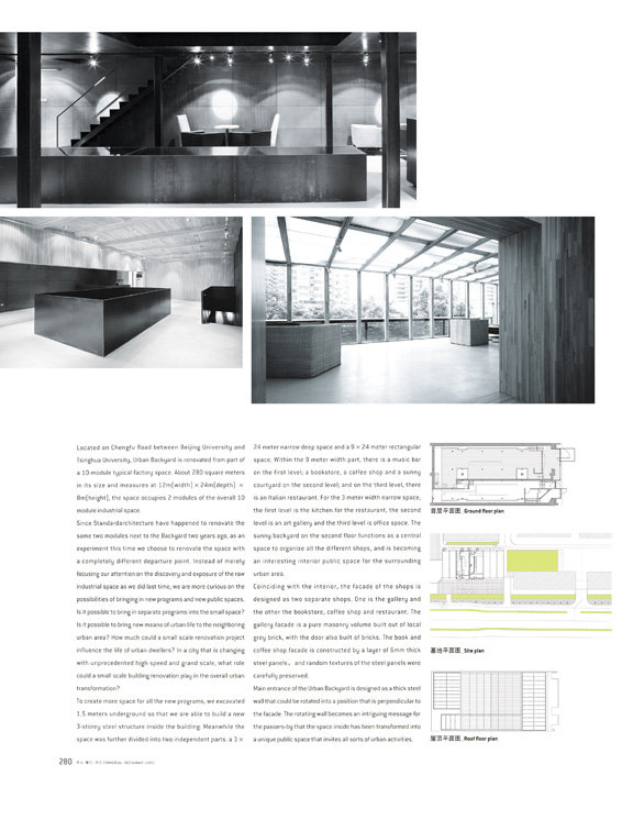 Located on Chengfu Road between Beijing University and Tsinghua University, urban backyard is renovated from part of a 10-module typical factory space. About 280 square meters in its size and measures at 12m(width) x 24m(depth) x 8m(height), the space occupies 2 modules of the overall 10 module industrial space.