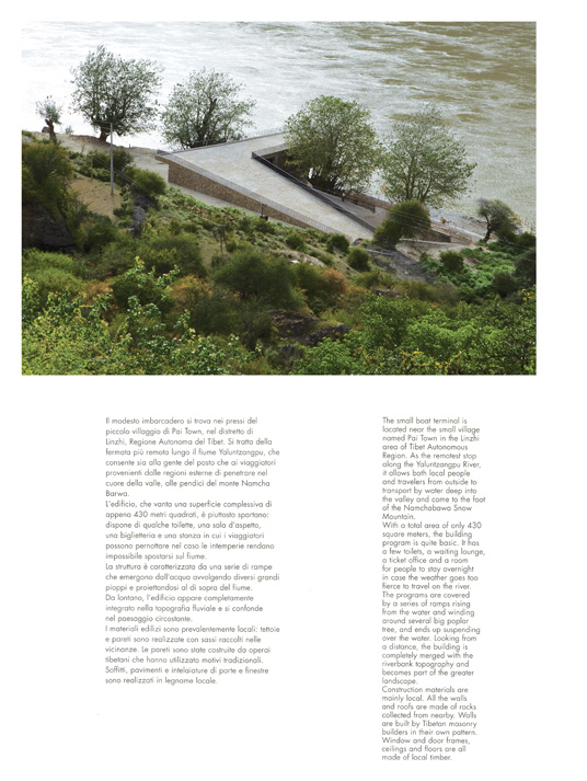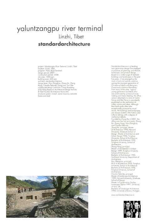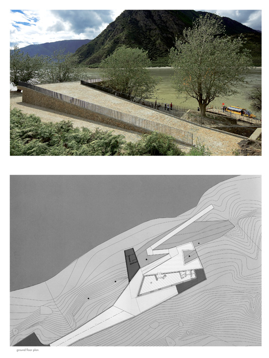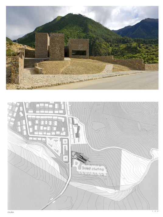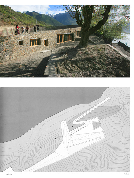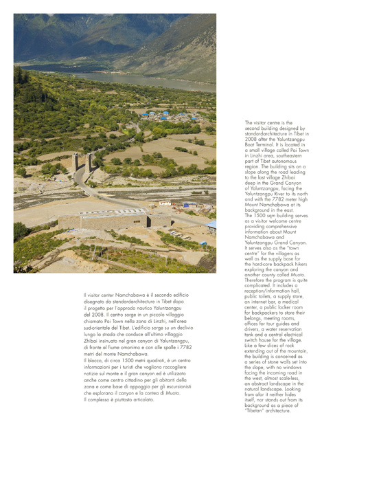 The visitor centre is the second building designed by standardarchitecture in Tibet in 2008 after the Yaluntzangpu Boat Terminal. It is located in a small village called Pai Town in Linzhi area, southeastern part of Tibet autonomous region. The building sits on a slope along the road leading to the last village Zhibai deep in the Grand Canyon of Yaluntzangpu, facing the Yaluntzangpu River to its north and with the 7782 meter high Mount Namchabawa at its background in the east.