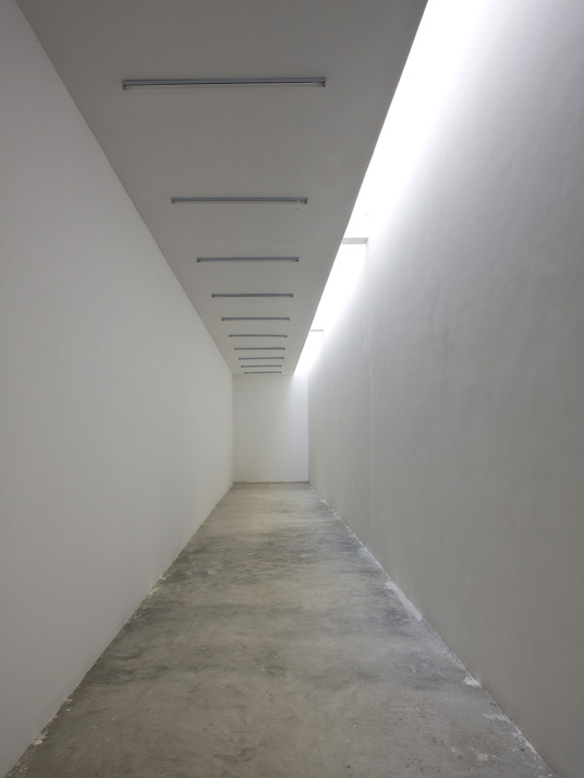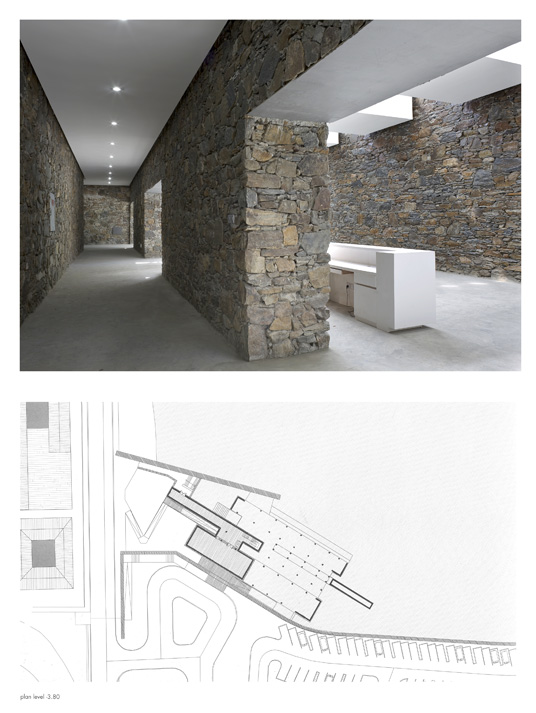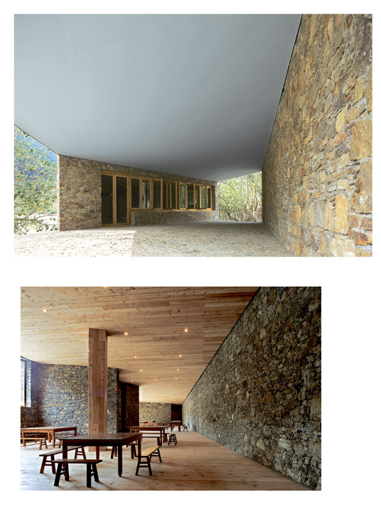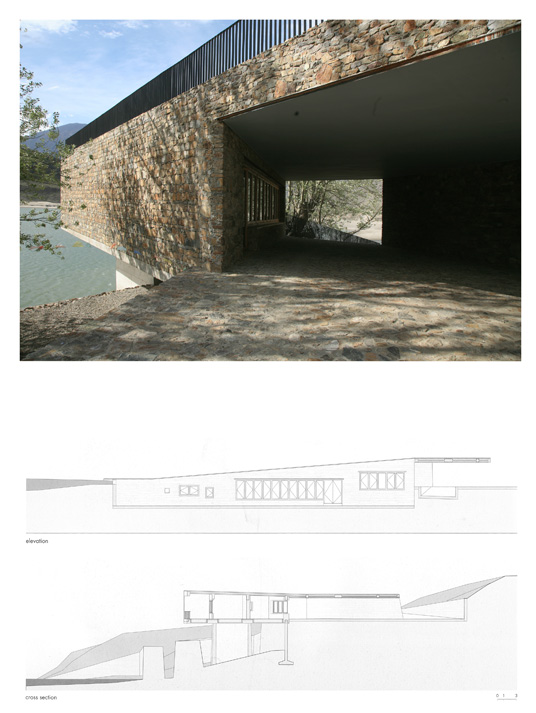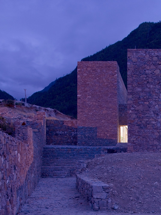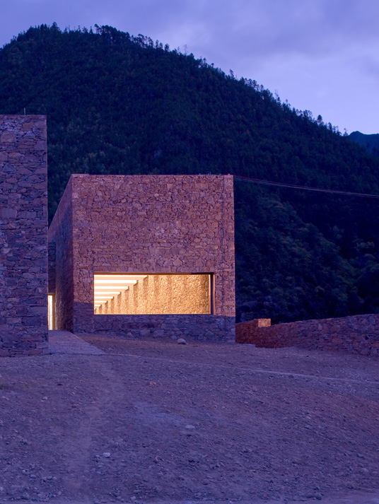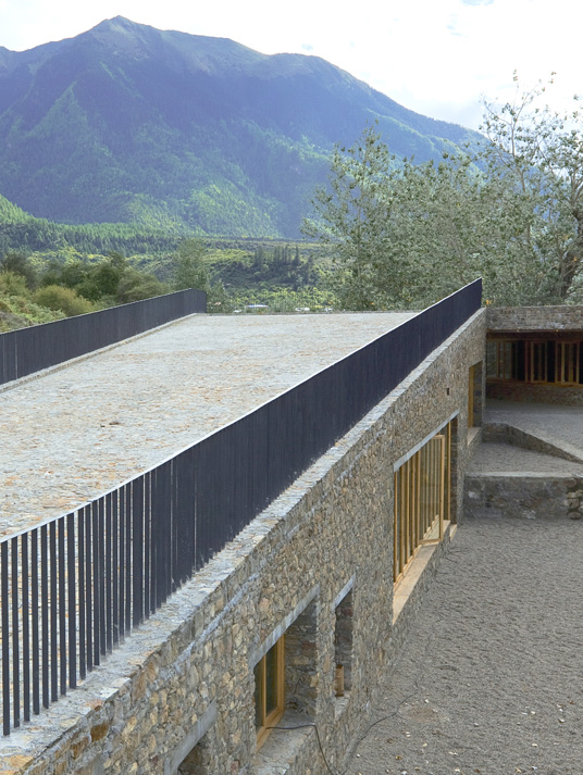 Like a few slices of rock extending out of the mountain, the building is conceived as a series of stone walls set into the slope, with no windows facing the incoming road in the west, almost scale-less, an abstract landscape in the natural landscape. Looking from afar it neither hides itself, nor stands out from its background as a piece of “Tibetan” architecture.