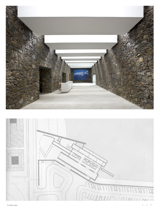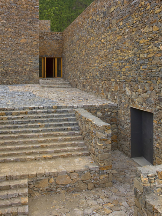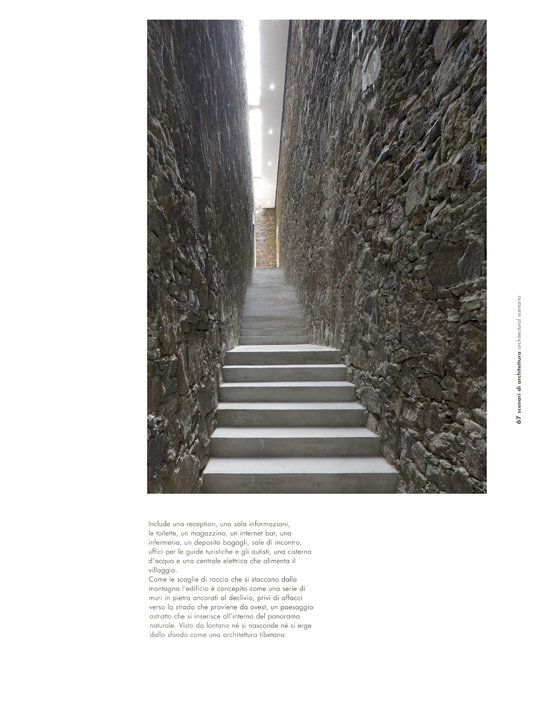 Come le scaglie di roccia che si staccano dalla montagna l'edificio è concepito come una serie di muri in pietra ancorati al declivio, privi di affacci verso la strada che proviene da ovest, un paesaggio astratto che si inserisce all'interno del panorama naturale. Visto da lontano né si nasconde né si erge dallo sfondo come una architettura tibetana.