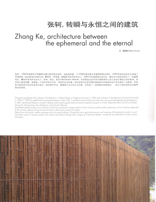 Zhang Ke graduated with a Master of Architecture in Urban Design at Tsinghua University in 1996 and a Master of Architecture at Harvard Universityin 1998. In 1999 he established standardarchitecture in New York, a professional partnership formed with a group of international young designers. In 2001 standardarchitecture moved to Beijing, following the good results of several important projects in China. Today the office has four principals: