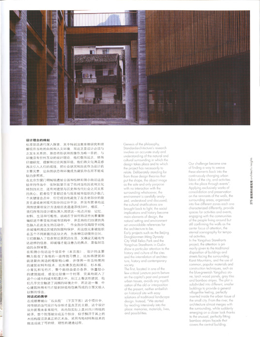 Early projects such as the Beijing Dongbianmen Ming Dynasty Cily Wall Relics Park and the Yangshuo Storefronts in Guilin show a particular attention to the history and culture of the sites and the interrelation of architecture, history and contemporary society.