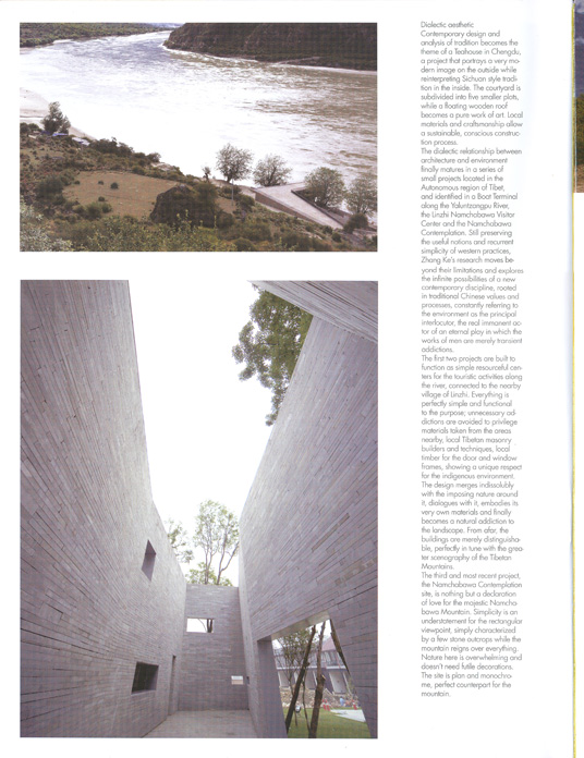 The dialectic relationship belween architecture and environment finally matures in a series of small projects located in the Autonomous region of Tibet, and identified in a Boat Terminal along the Yaluntzangpu River, the Linzhi Namchabawa Visitor Center and the Namchabawa Contemplation. Still preserving the useful notions and recurrent simplicity of western practices, Zhang Ke's research moves be-yond their limitations and explores the infinite possibilities of a new contemporary discipline, rooted in traditional Chinese values and processes, constantly referring to the environment as the principal interlocutor, the real immanent ac-tor of an eternal play in which the works of men are merely transient addictions.