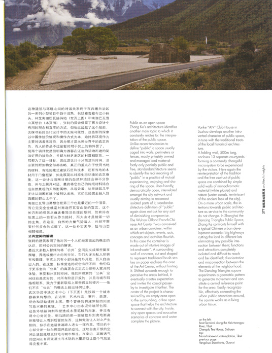 Zhang Ke continues his rese-arch following different paths, sometimes seemingly contrappo-sing but always focusing on the research of a method. Innovative structural systems applied to a design always conscious of its social responsibility and fun-ctions produces iconic, landmark architectures that become identifying elements of the city; besides, the discovery of local cultures and traditions develops in new projects establishing a perfect harmony between the contemporary and the past. Duality seems to be omnipresent in standardarchitecture projects, challenging the potentiality of extremely different approaches following the same method and philosophy. The public space can be openly evident or jealously concealed behind a perimeter, still never fails to be free and directed towards the people, for the people to enjoy and appropriate.