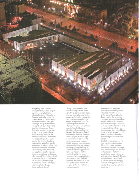 Distant from thriving for media coverage and loud trendy solutions, Zhang Ke tries to get to the essence and meaning of the places he works in; each one of his works is "always rooted in the historic and cultural settings with a degree of intellectual debate", aiming for the realization of urban visions and ideas.