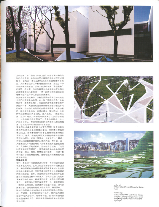 在更城市化的氛围中,张轲仍然没有改变让公共建筑为邻近社区服务的意图,在上海“舞蹈的三角”公共空间中(本页右上图),他面对的是中国城市发展中典型的一幕:大型的高速公路网络将土地切割成不同的区块,让他们之间的互动变得非常困难;城市功能的一面与居民生活的一面彼此孤立,难以跨越;社区的构成要素之间关系错乱,让人迷失。“舞蹈的三角”这个广场用几何形的布局提高了人员流动的能力,并且给这个地区创造了一个中心参照点。这一广场易于辨认,有效地将周围的公共生活元素连接起来,已然成为一片活生生的城市组织。