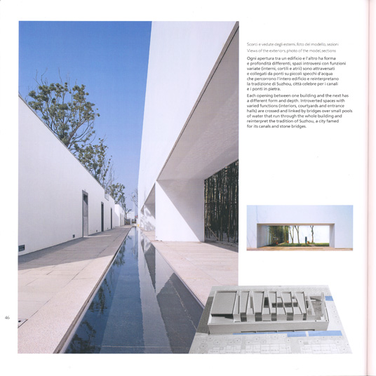 Each opening between one building and the next has a different form and depth. Introverted spaces with varied functions (interiors, courtyards and entrance halls) are crossed and linked by bridges over small pools of water that run through the whole building and reinterpret the tradition of Suzhou, a city famed for its canals and stone bridges.
