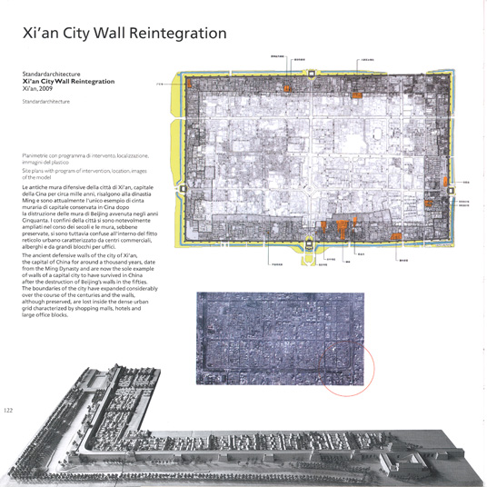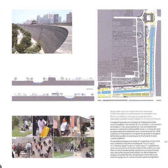 The project envisages a strategy of integration of the walls that is based on the three concepts of Cheng ("city"), Shi("street market") and ye ("wild nature"). A pedestrian zone runs along the inner perimeter of the walls in an area that will be characterized by traditional courtyard houses (tea and coffee houses and hostels); on the outside the program provides for the rehabilitation of the old canal and the laying out of a series of public parks and gardens.