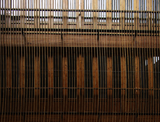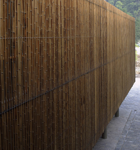 Seen from a distance, the storefronts have nothing startling. While coming closer, most people will be surprised by the appearance of the central building. Bamboo stripes of 6-meter-long and 6-centimeter-wide are placed at 8 centimeter distance from each other, with right angle to the building facade. Behind the bamboo layer, there is a layer of folding wood panels. When the wood panels are opened, people could have a sense that there is only a curtain of bamboo stripes between them and the Karst Mountains.