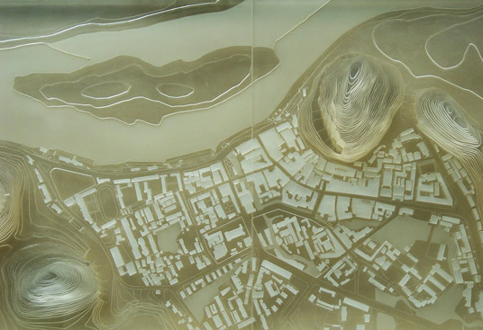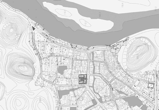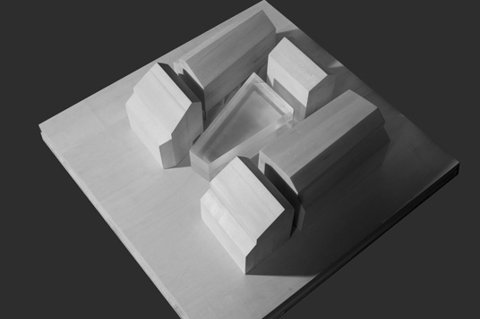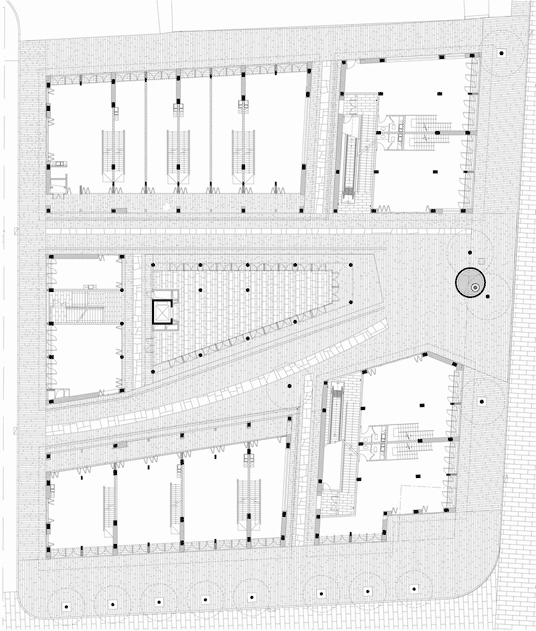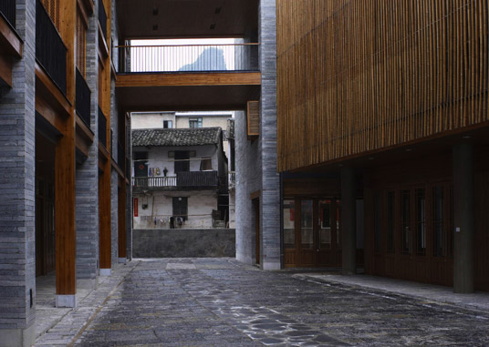 The small neighborhood is built on a block of 2300 sqm and is comprised of five small alleys and six separate buildings. The buildings occupy the entire boundary of the site, and the main alleys inside work as continuations of the neighboring urban fabric. We adopted a native way to have the main alleys point toward the major mountains nearby, namely the Lotus and the Dragon Head Mountain. As a result of this layout, all the six buildings become irregular in their plans. On the ground floor there are small shops and the shop owners live on the second floor. There are corridors linking all the buildings on the 3rd and 4th floor. Units of these floors each have a bathroom and a kitchen. They could function either as apartments or as shops. Passing through the bridges linking each building, people will always find special views toward the surrounding Karst Mountains.