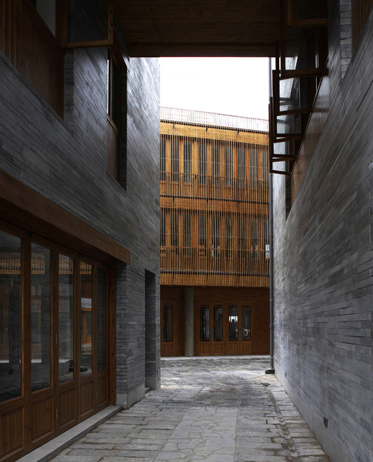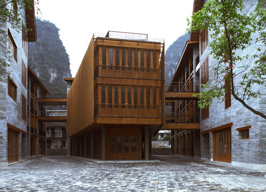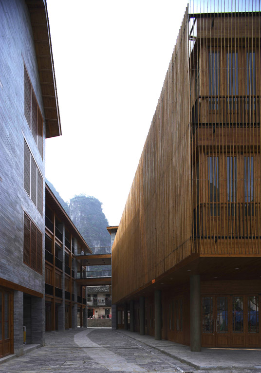 The neighborhood is built mainly with four local materials: the blue-greenish Yangshuo stone, Larch wood panels, small grey tiles and bamboo stripes. The “city control regulation” asks for all the buildings to be painted white. We found the regulation is a total mistake. The local villages never have large area of white-washed walls. The villages were all built with exposed local stone and grey bricks.