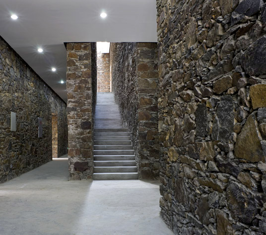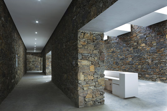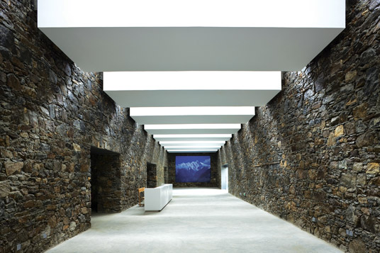 我们显然对本地建筑形式的模仿和拼凑不感兴趣,也显然对移植一个时尚的外来建筑不感兴趣,接待站是一个形式上很不显眼的建筑,远远看去,当地人甚至看不出它有什么新奇,它随行就势,由几个高低不一、厚薄不同的石头墙体从山坡不同高度随意地生长出来的体量构成,墙体内部是相应的功能空间,这样多数功能空间实际上是半掩藏在山坡下的。