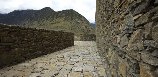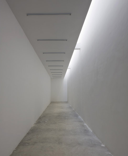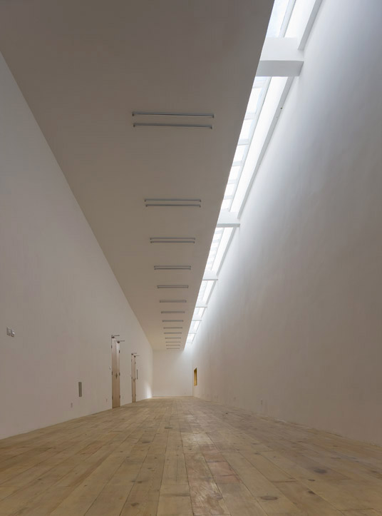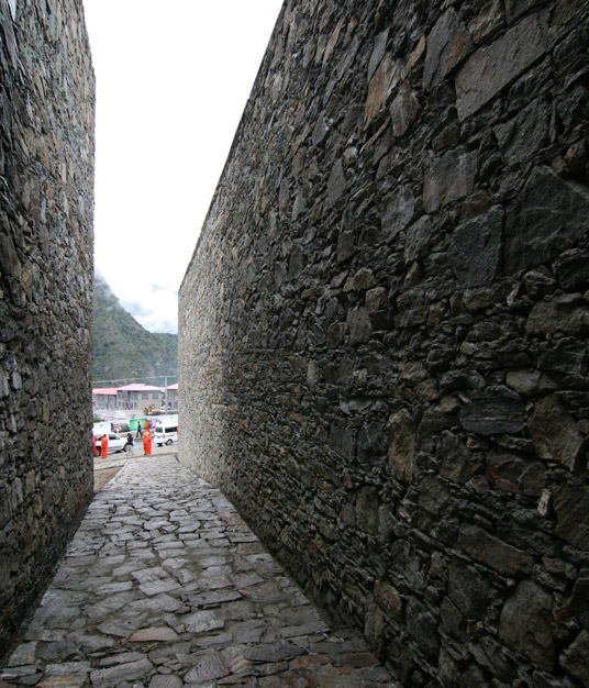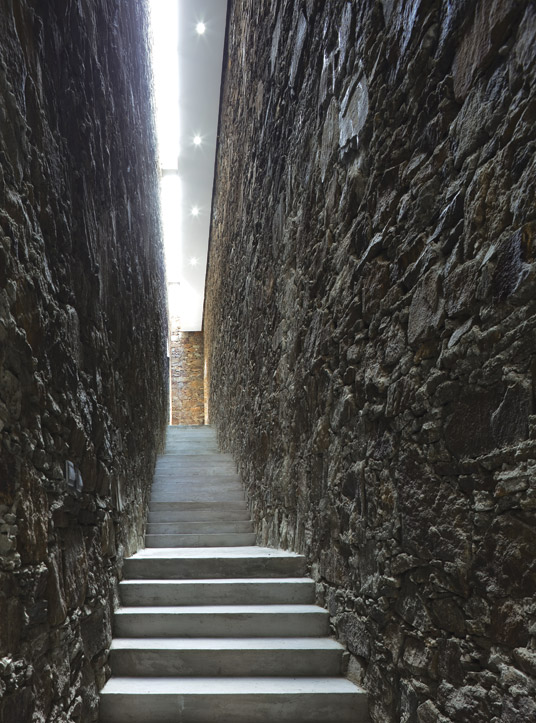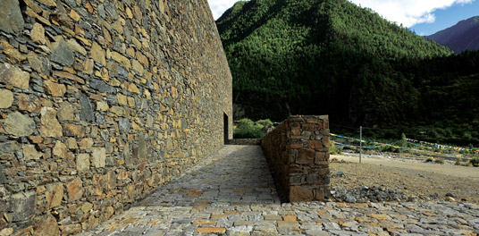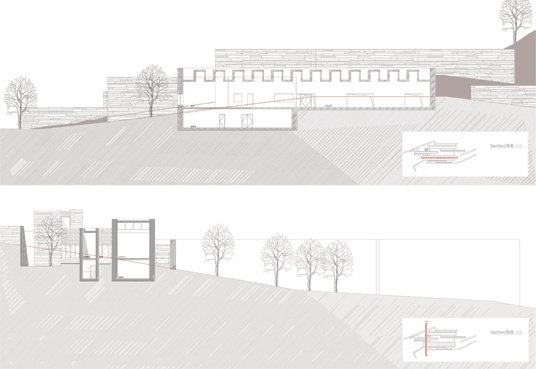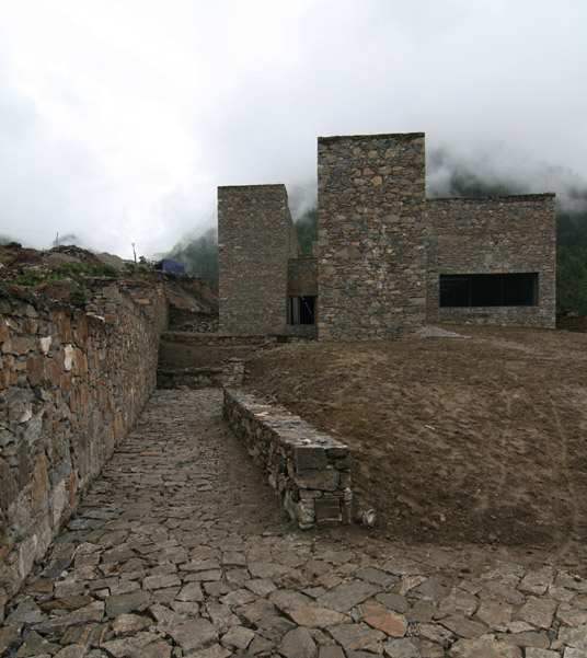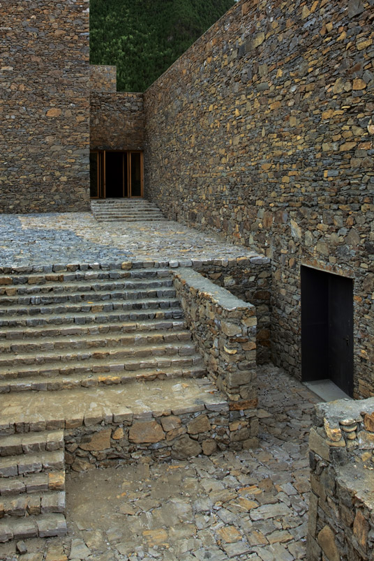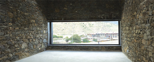 Like a few slices of rock extending out of the mountain, the building is conceived as a series of stone walls set into the slope, with no windows facing the incoming road in the west, almost scale-less, an abstract landscape in the natural landscape. Looking from afar it neither hides itself, nor stands out from its background as a piece of “Tibetan” architecture.