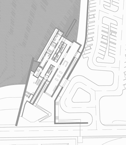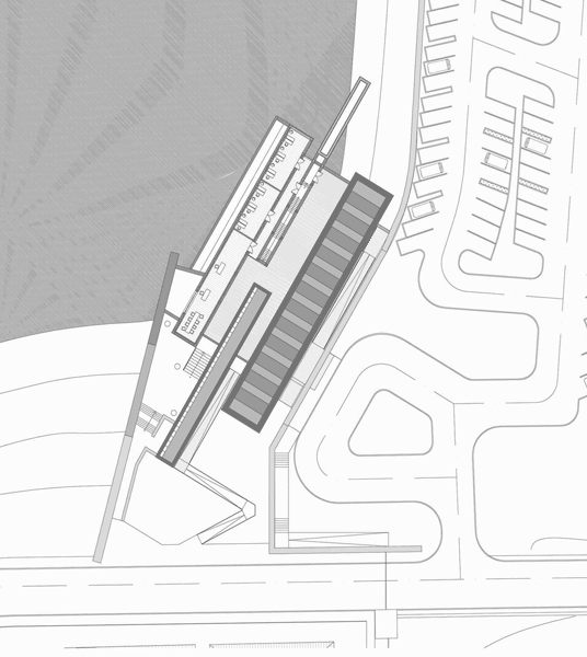 建筑随着基础的标高不同分为三层,地下一层是储藏室和集中配电房;一层主要是各种接待空间,大峡谷信息展厅、厕所、医务室、网吧小卖部、景区售票检票都在这一层;二层是后勤办公室和可供游客休息观景的屋顶平台。建筑的采光主要通过天窗解决,天窗分为两种,接待大厅采用屋顶凹陷形成的高侧窗,楼梯、网吧和办公室采用的是细长的天窗,整个建筑只在一层接待大厅朝向雅鲁藏布江及加拉白垒雪山的方向和二层办公室朝向南迦巴瓦雪山的方向开了两个明确的景观视窗。