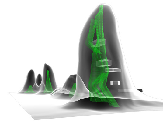 ZK: In terms of cityscape it is very hard to say that if it is architecture or only a landscape. It is both architecture and landscape at the same time. Basically we are creating man-made landform that is very tall so that various people could have the opportunities to practice the mountain climbing and agriculture learning classes and you can also go there to experience the art works and performances if enter from underground through the subway or parking area. But the outside surfaces are all naturally looking, except of a few of jewelry points on the mountain, they are the cultural facilities. And the openings also provide the possibility to see the Victoria Bay. In directions that were exclusive for high office towers, in the past you have to be someone who is able to have the view and enjoy it, because you have money or social position that allows you to be there. But here in this area it is open to everyone. You can simply climb outside of the mountain and enjoy the view. Also most importantly is that financially it’s feasible. I think by providing more space, by putting the cultural centre inserted or actually imbedded in the mountain, we save at least two third of the land for other possible of the land development. Because financially I believe there need to be someone who has the motivation and interest to build the cultural facilities in this scale. It couldn’t be simply from donations of any institutions. It needs to be balanced in terms of financial budgeting. ……….and even inside of the mountain, there would be commercial developments, too. The cultural facilities are taking at most one tenth of the space of the mountain. Nine tenth of the space inside the mountain could be hotels, shopping centers. So it could be the Hong Kong cultural mountain terrace land and maybe the tallest department store in the world.