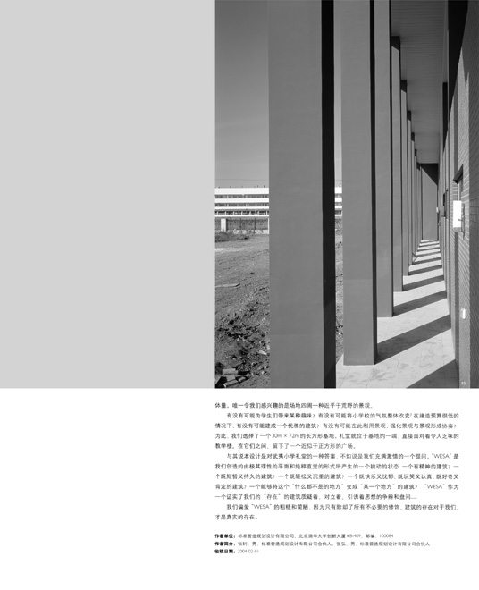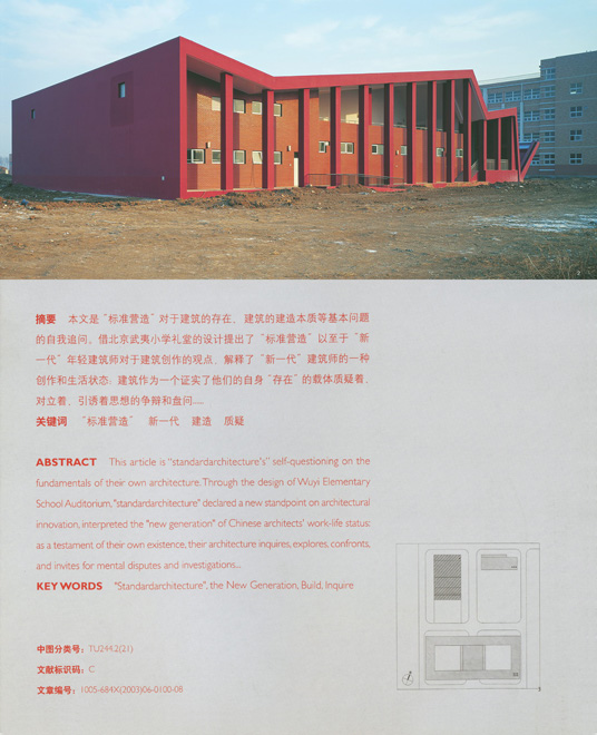 ABSTRACT: This article is "Standardarchitecture's" self-questioning on the fundamentals of their own architecture. Through the design of Wuyi Elementary School Auditorium, "Standardarchitecture" declared a new standpoint on architectural innovation, interpreted the "new generation" of Chinese architects' work-life status: as a testament of their own existence, their architecture inquires, explores, confronts, and invites for mental disputes and investigations...