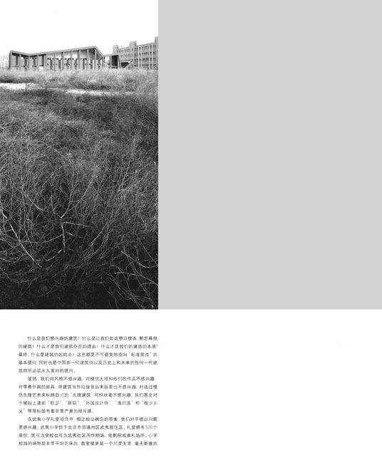 在武夷小学礼堂项目中,相比给出确定的答案,我们对于提出问题更感兴趣。武夷小学位于北京市郊通州区武夷居住区。礼堂拥有520个座位,既可为学校也可为武夷社区用作剧场、电影院或典礼场所。小学校园的场地也是非常平坦乏味的,教室楼更是一个尺度失常,毫无新意的体量。唯一令我们感兴趣的是场地四周一种近乎于荒野的景观。