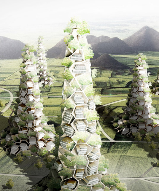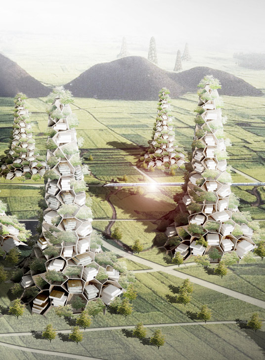 Standardarchitecture takes an inquisitive attitude towards the excessive expansion of Chinese cities, questioning whether the urbanization of archetypical cities such as East Village can occur without sacrificing arable land, and looks into the possibility of vertical expansion to accommodate the growth of cities.The ‘Vertical Village’ proposes a universal strategy for the co-existence of city and farmland, annulling the previous differentiation between the two. With the building extents allocated to each household by volume instead of land area, the residents are able to construct their homes inside the space of the nests, have poultry around the house, and descend the mountains to cultivate the farmlands. "Vertical Village" is a somewhat naive proposal, and we do not advocate it as a cure for all the issues of urbanization and land shortage.Instead, we want to revive in people a longing for a life closer to nature, and assert confidence in the future prospect of harmonious integration of the city and farmland.